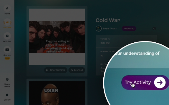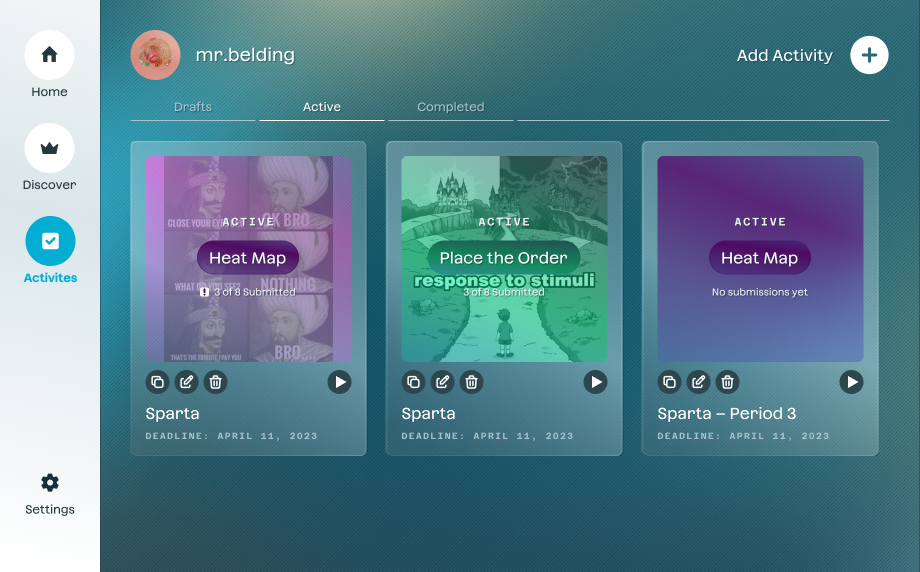 The coolest thing that this makes possible is remixing. Found a clever activity run by another teacher on our Discover page? You can immediately launch into setting up the activity yourself with the same parameters.