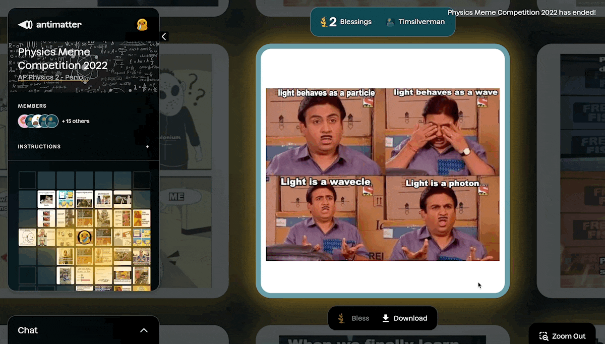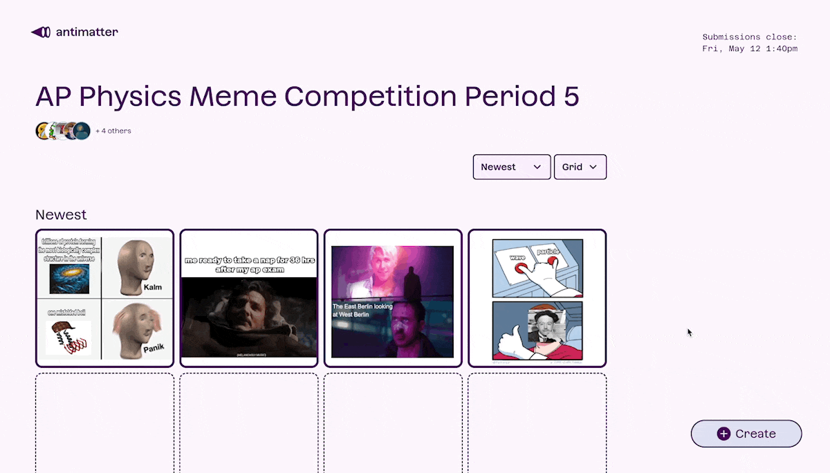 • Meme Competition: Have your students create memes that summarize the key concepts they learned throughout the year. This activity can be a fun and creative way to blow off some steam while also incorporating humor and pop culture references. Try the Fan Favorite activity on Antimatter for this one! Fan Favorite was created for all-purpose meme competitions for students of 20 or more. Students can get upvotes from family and friends, too!