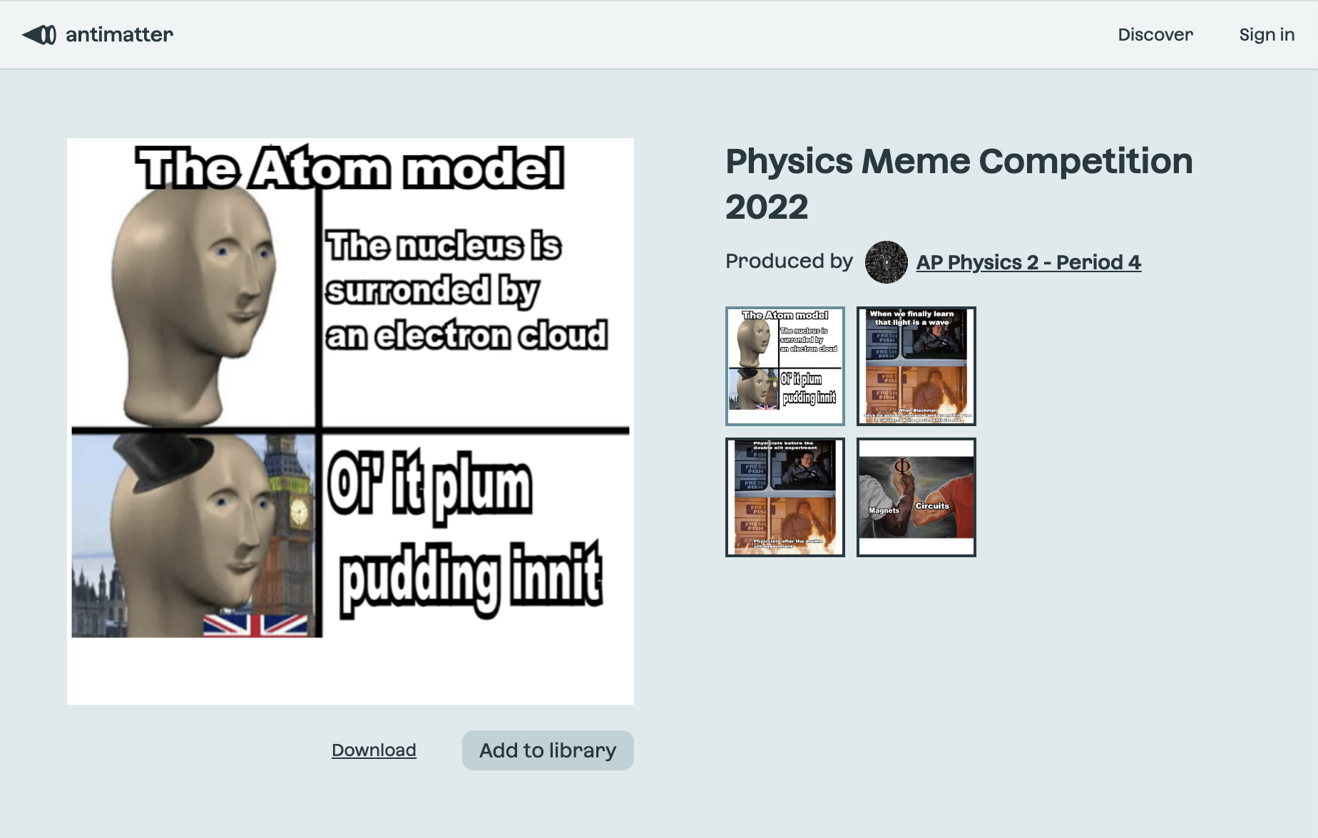 Increases the amount of learning material in the world? Yes! Here's how Antimatter turns every classroom into a publisher of learning material.Publish the best memes when you close a space.
