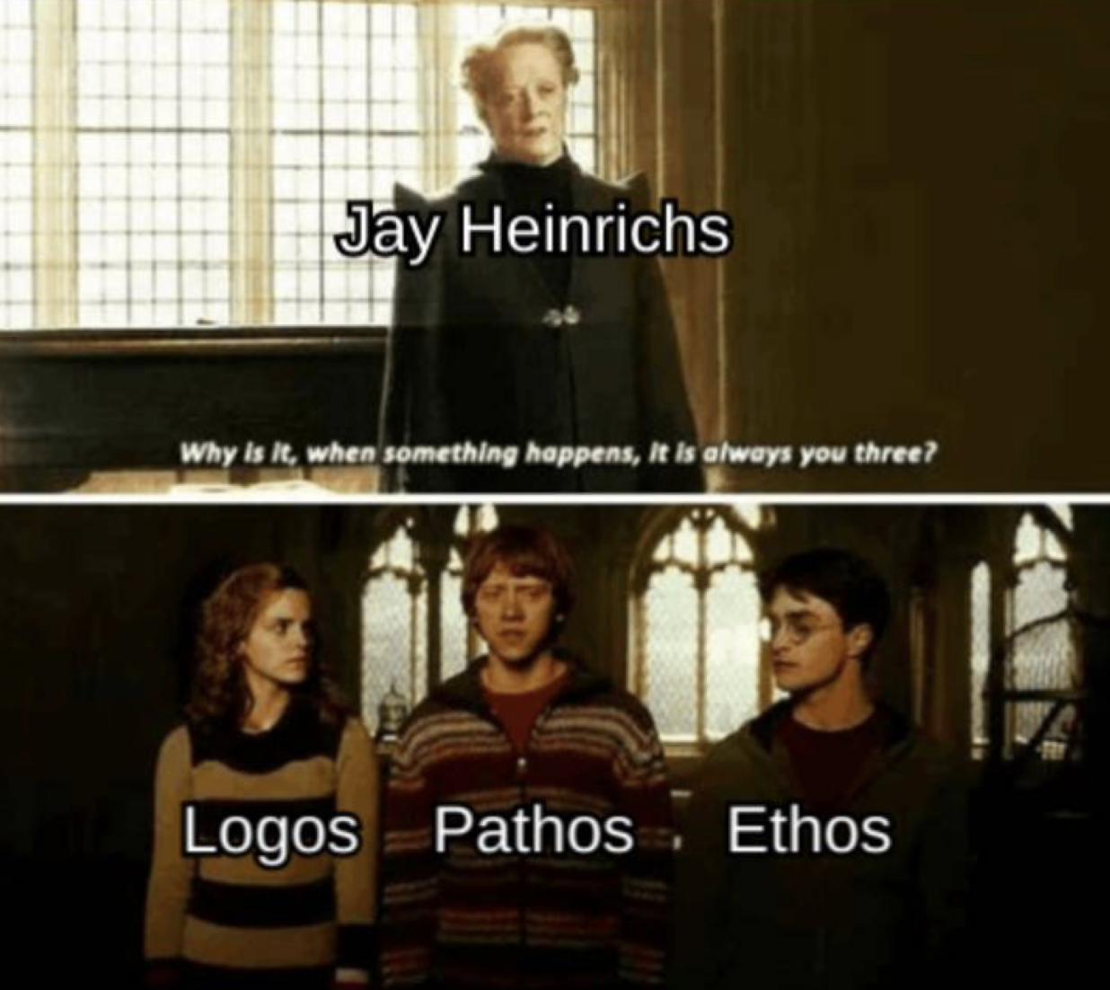 This week's selection begins with an English class' review about Jay Heinrichs' rhetoric, makes its way to the Progressive Era in US History and Revolutionary War, then takes an unexpected turn with a physics and an algebra meme from two different classrooms.