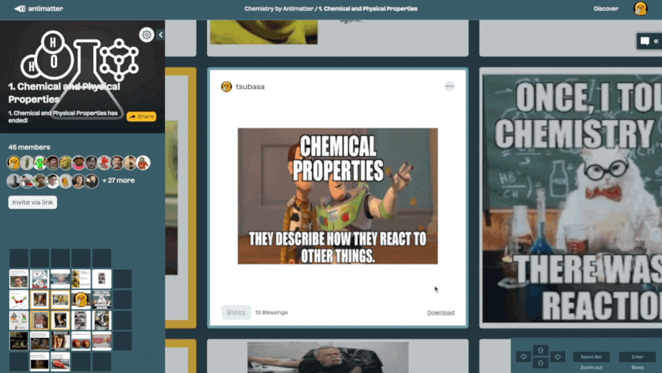 Today we offer one activity—the grid—where every student in your classroom is invited to create memes that others can bless (“upvoting” in Antimatter’s terminology). We’re now about to embark on building new activities to engage and inspire your students.