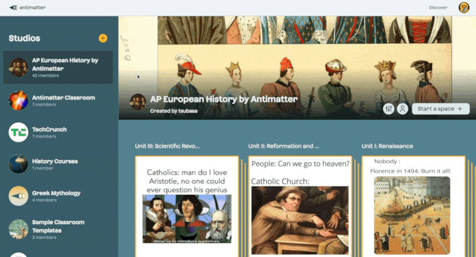 - Try to award your students. On Antimatter's legendary grid-style spaces, your students can collaborate and "bless" each other's creations to choose the best memes. The most blessed memes could earn the student a sticker or some extra points!