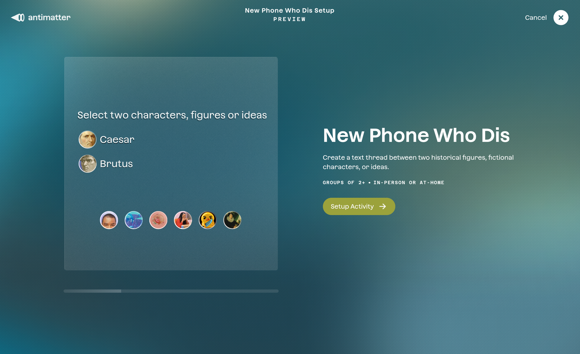 Today we’re introducing the first activity on Antimatter that isn’t about Uppercase “Memes”. It’s called New Phone Who Dis, and it’s an activity where students can role play as a historical figure, fictional character, or even a concept from math or science, within a simulated text chat on an iPhone. Check it out (sound up!):