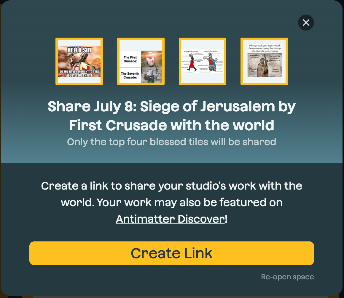 Space Timers enable you to set when Antimatter Spaces end. Ending a space brings some finality to your classroom's experience, enabling you and your students to celebrate the memes that made it to the center (or, as we call it, the Blessed Area).